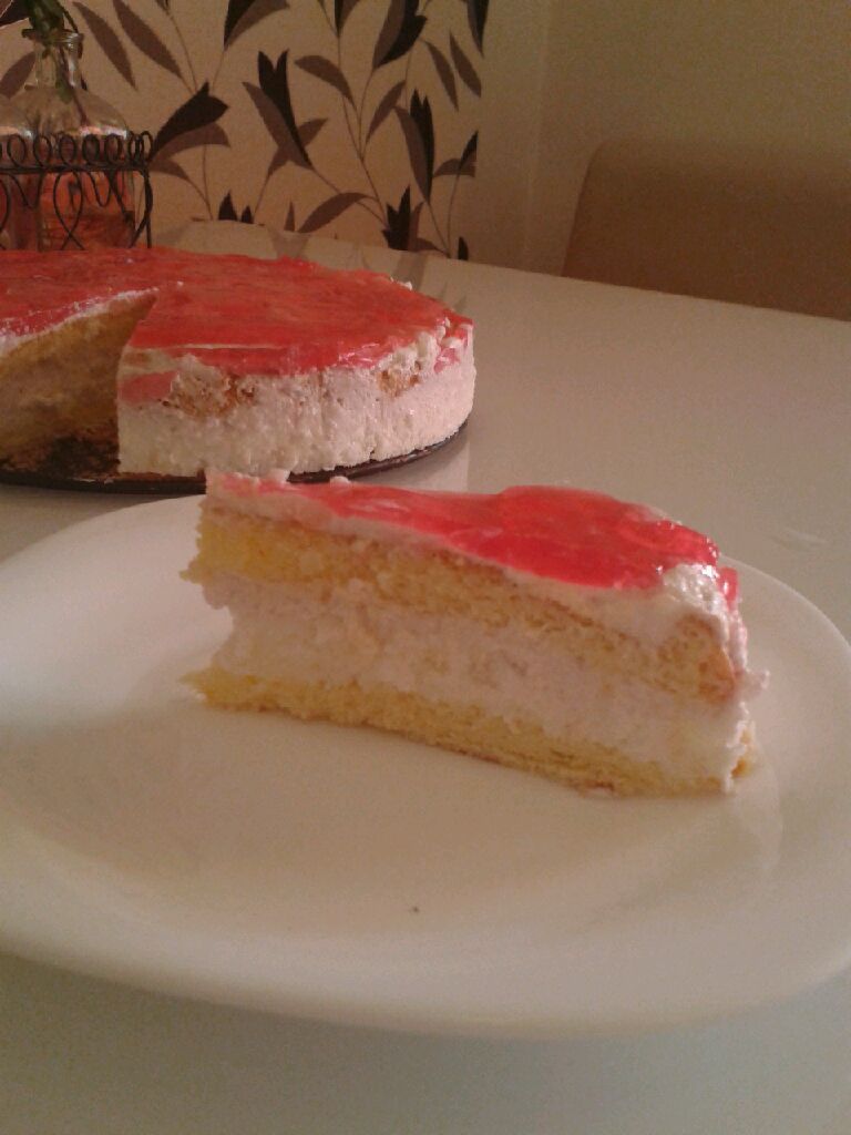 Upečený korpus nechte vychladnout. Vychladlý překrojte na dva pláty. Teď si připravte krém: Tvaroh, zakysanou smetanu jogurt a oba cukry šlehejte. Do skteničky si nalijte 150 ml vody a vsypte želatinový stužovač. Míchejte metličkou, aby se nevytvořily hrudky (tak jako mně :D). Poté směs vlijte do připraveného krému a promíchejte.